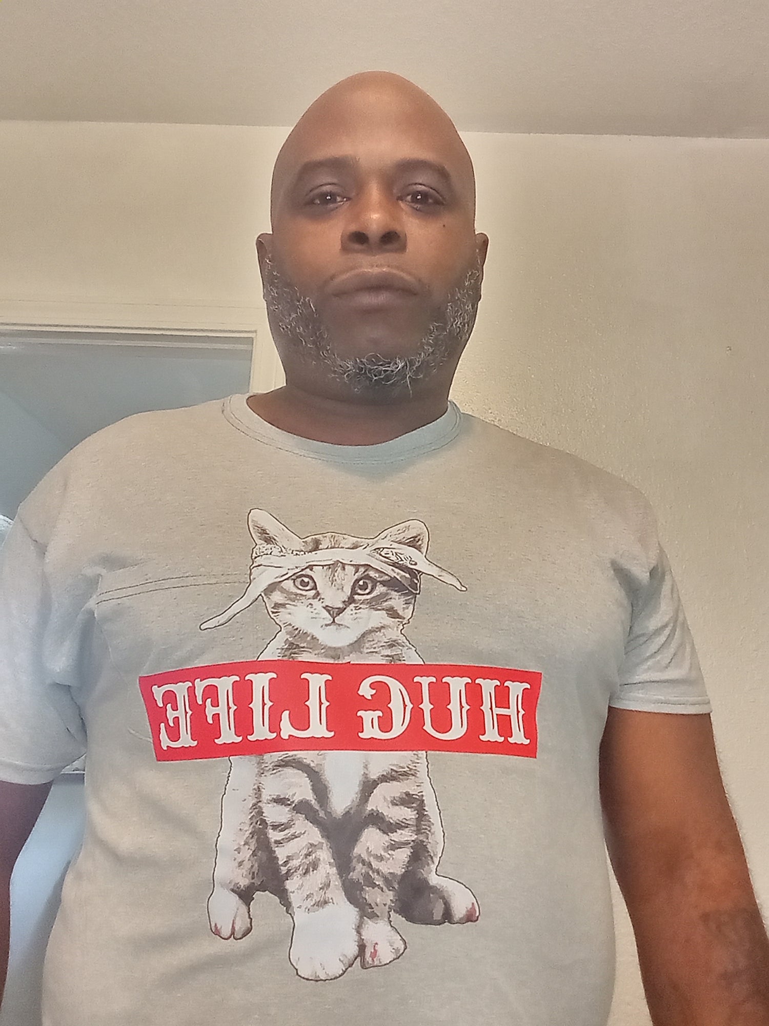 HugLife written on the shirt with a cat in a Tupac bandana....